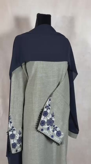 Includes: Matching navy chiffon khimar with gray linen trim.